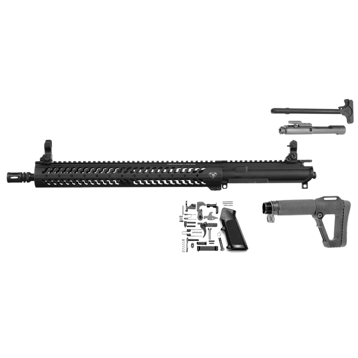 Our Always Ready Carbine Kit starts with a 5.56 chambered 16" lightweight barrel made from 4140 chrome moly steel utilizing the CAR length gas system. This nitrided barrel is attached to our flattop upper with Samson's 15" Evolution aluminum free floating handguard. The upper is fully assembled with our charging handle with Tac Latch, semi-auto bolt carrier group and topped with flip up front and rear iron sights. To finish out your stripped lower receiver (not included) we use our standard lower parts kit upgraded with an Ergo Suregrip and the Ace SOCOM buttstock. All parts are completely made in the USA.