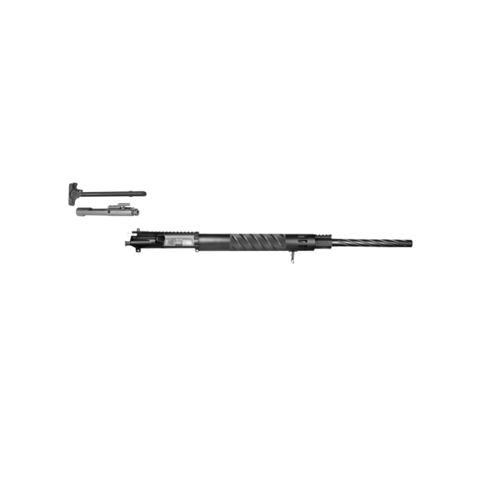Our Midnight Dragon Complete Upper starts with our 5.56 chambered 24" helical fluted bull barrel made from 416 SS utilizing the rifle length gas system. This nitrided match barrel is attached to our flattop upper with our helical fluted rifle length aluminum free floating handguard. The upper is fully assembled with our charging handle and semi-auto bolt carrier group. All parts are completely made in the USA.