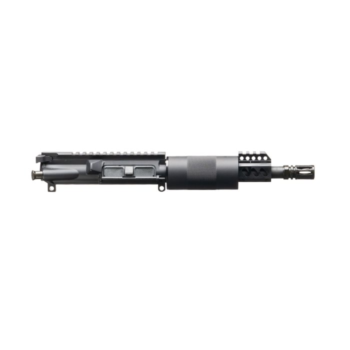 Our flattop upper starts with a .300 BLK chambered 1-8 twist 7.5" barrel made from 4140 chrome moly steel. This barrel is mounted to our mil-spec flattop upper and uses our pistol-length aluminum free float handguard and gas system. The upper is fully assembled and all parts are completely made in the USA.